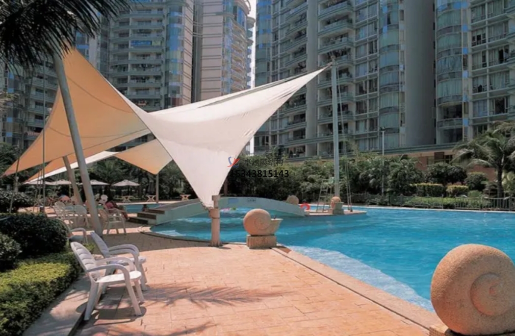 膜結(jié)構(gòu)遮陽(yáng)棚的設(shè)計(jì)靈活多變,可以根據(jù)不同的場(chǎng)地和需求進(jìn)行定制。其獨(dú)特的造型和線條流暢的外觀,能夠與現(xiàn)代建筑風(fēng)格完美融合,提升整體建筑的美觀度和檔次。同時(shí),膜結(jié)構(gòu)遮陽(yáng)棚還賦予了設(shè)計(jì)師更大的發(fā)揮空間,可以賦予遮陽(yáng)棚更多曲面、線條,使得整個(gè)遮陽(yáng)棚看起來(lái)非常具有張力及雕塑感,成為游泳池邊上一道獨(dú)特的風(fēng)景線。