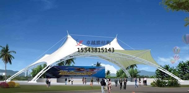 用于張拉膜景觀中的高強度柔韌薄膜稱膜材,它是一種耐久用、高強度的涂層織物,由織物和涂層復合而成,具有質(zhì)地柔韌、厚度小、重量輕、透光性好的特點。對自然光吸收和透射能力、阻燃,具有良好的耐久、防火、氣密等特性;
