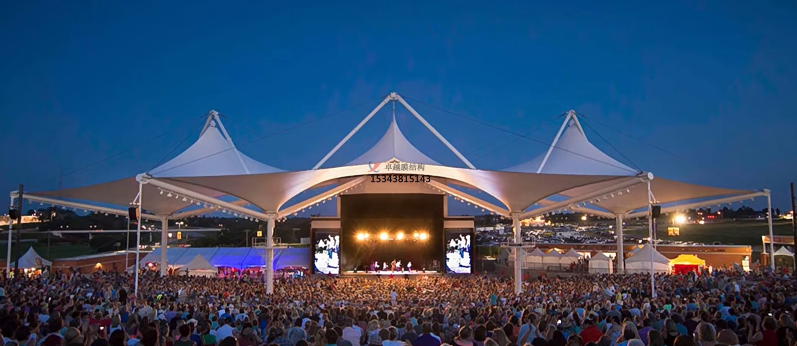 舞臺(tái)膜結(jié)構(gòu)遮陽(yáng)棚以其獨(dú)特的藝術(shù)魅力和實(shí)用的功能特性,逐漸成為眾多演出場(chǎng)所的首選。它不僅為舞臺(tái)表演提供了理想的遮陽(yáng)和防雨解決方案,還通過其創(chuàng)新的設(shè)計(jì)和多樣化的造型,為觀眾帶來了全新的視覺體驗(yàn)。
