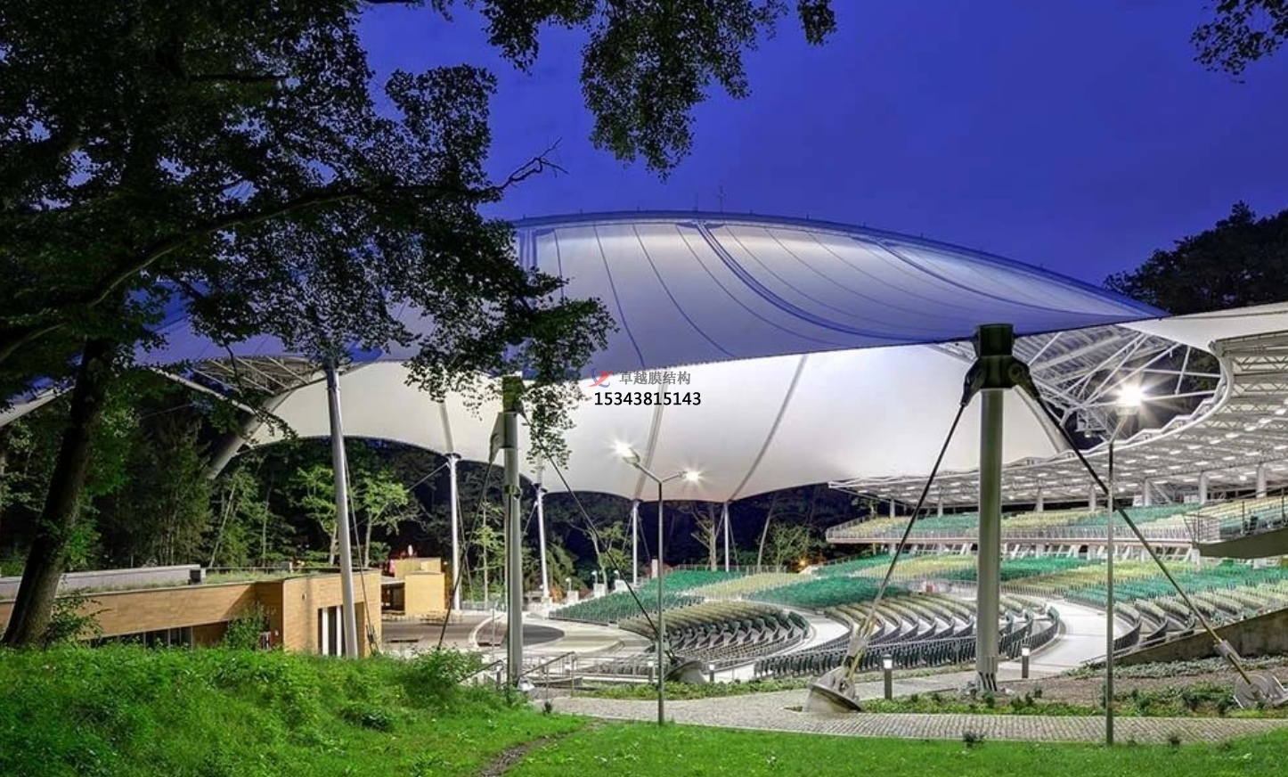 舞臺(tái)膜結(jié)構(gòu)遮陽(yáng)棚的膜材料具有一定的透光性,可以根據(jù)演出需要調(diào)節(jié)光線的明暗和色彩。在白天,自然光透過膜材料灑落在舞臺(tái)上,為演出增添了一份自然和溫馨;在夜晚,舞臺(tái)燈光與膜材料的透光性相結(jié)合,可以營(yíng)造出夢(mèng)幻般的舞臺(tái)效果。