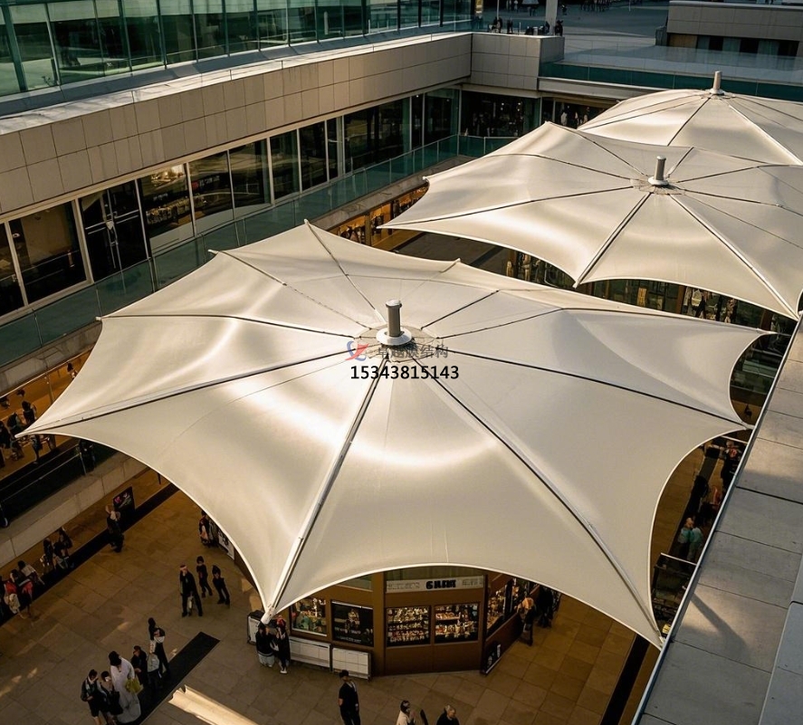 露天步行商業(yè)街的公共座椅旁,膜結(jié)構(gòu)遮陽傘是常見的配置。它與傳統(tǒng)可移動遮陽傘不同,采用先預(yù)埋基礎(chǔ),再搭建鋼構(gòu),最后張拉膜材的方式固定。其造型豐富多樣,顏色可根據(jù)整體環(huán)境定制,不僅具備出色的抗紫外線、抗老化性能,使用壽命長,而且自潔性好,為商業(yè)街增添了一抹亮麗色彩,成為實(shí)用與美觀兼具的景觀設(shè)施。