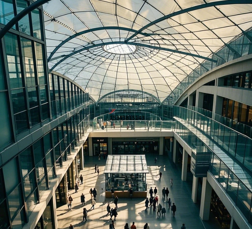 在大型商業(yè)廣場的廊道或大廳頂部,常能見到膜結(jié)構(gòu)穹頂與天幕的身影。以往,實(shí)現(xiàn)自然采光多依賴陽光板或鋼化玻璃,然而陽光板易老化,鋼化玻璃自重過大且存在安全隱患。膜結(jié)構(gòu)的出現(xiàn)改變了這一局面,PTFE 及 ETFE 膜材透光性佳、自重輕、安全性高,尤其是 ETFE,其高自潔、高透光特性,讓穹頂天幕在白天引入充足自然光線,節(jié)省照明能耗,夜晚在燈光映照下,又營造出如夢如幻的氛圍,為顧客帶來獨(dú)特的購物體驗(yàn)。